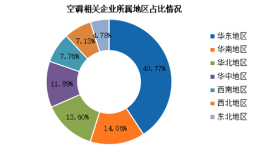 企查查數(shù)據(jù)顯示,截至目前,國內(nèi)空調(diào)相關(guān)現(xiàn)存企業(yè)達(dá)164.42萬家,主要分布在華東地區(qū),占比達(dá)40.77%。其次為華南地區(qū)、華北地區(qū)、華中地區(qū),分別占比14.06%、13.6%、11.89%。