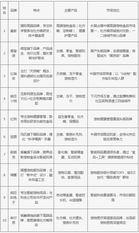 國(guó)際品牌(皇家、希爾思)憑借處方糧技術(shù)、獸醫(yī)渠道綁定穩(wěn)居高端市場(chǎng),國(guó)產(chǎn)頭部品牌(麥富迪、比瑞吉)通過(guò)全品類(lèi)覆蓋、差異化定位(天然糧、健康管理)搶占中端市場(chǎng),下沉市場(chǎng)由高性?xún)r(jià)比品牌(瘋狂小狗)主導(dǎo),智能科技(瘋狂的兔子)與國(guó)潮服飾(喵醬)等細(xì)分賽道黑馬涌現(xiàn)。