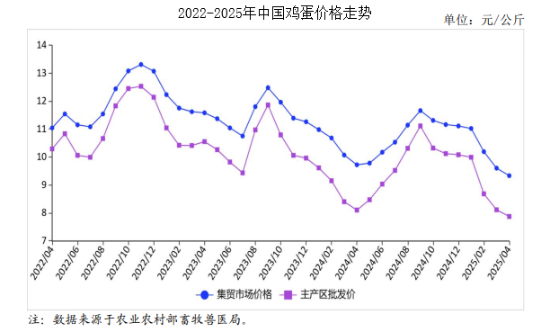2025年4月,雞蛋價(jià)格先跌后漲。在產(chǎn)蛋雞存欄量穩(wěn)中有增,雞蛋市場(chǎng)供應(yīng)充足。端午節(jié)前,雞蛋消費(fèi)需求有望增加,后期隨著氣溫升高、南方降雨量增加,雞蛋市場(chǎng)需求趨弱,預(yù)計(jì)價(jià)格震蕩運(yùn)行。