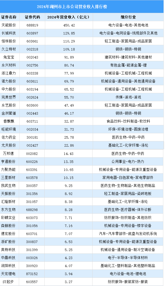 目前,A股上市公司相繼發(fā)布2024年年度報(bào)告。本榜單以2024年?duì)I業(yè)收入為標(biāo)準(zhǔn),匯總了湖州市上市公司營(yíng)業(yè)收入排名。
