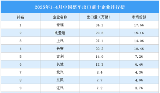 1-4月,汽車(chē)整車(chē)出口193.7萬(wàn)輛,同比增長(zhǎng)6%。整車(chē)出口前十企業(yè)出口量合計(jì)167.1萬(wàn)輛,市場(chǎng)份額合計(jì)86.3%。其中,奇瑞出口量達(dá)34.1萬(wàn)輛,同比下降0.3%,市場(chǎng)份額17.6%。比亞迪、上汽排名第二和第三,出口量分別為29.3萬(wàn)輛、27.1萬(wàn)輛,長(zhǎng)安、吉利、長(zhǎng)城、北汽、東風(fēng)、江汽、特斯拉進(jìn)入前十,依次排名第4-10名。