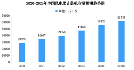 2024年全國風電機組新增裝機14388臺,容量8699萬千瓦,同比增長9.6%。截至2024年底,累計裝機超過20.9萬臺,共計56126萬千瓦,同比增長18.3%。2025年中國風電機組累計裝機容量將超過60000萬千瓦。