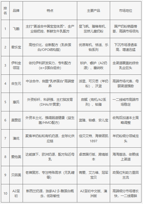 中國(guó)奶粉市場(chǎng)競(jìng)爭(zhēng)激烈,國(guó)產(chǎn)品牌與外資品牌共同占據(jù)市場(chǎng)。2025年中國(guó)最受消費(fèi)者喜愛(ài)的十大奶粉品牌分別為飛鶴、君樂(lè)寶、伊利金領(lǐng)冠、合生元、惠氏、美贊臣、澳優(yōu)、愛(ài)他美、貝因美、A2至初。