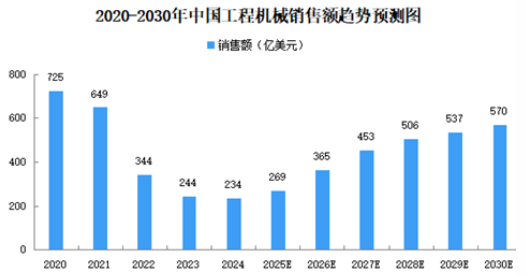 隨著基礎(chǔ)設(shè)施逐步完善,需求預(yù)計(jì)將更多轉(zhuǎn)向設(shè)備更新和智能化升級(jí)。政府大力推動(dòng)新基建、智能制造2025和雙碳目標(biāo)等舉措,加速了智能化和電動(dòng)化技術(shù)的普及,推動(dòng)行業(yè)綠色轉(zhuǎn)型和技術(shù)創(chuàng)新。這些趨勢(shì)使中國(guó)成為全球市場(chǎng)的重要增長(zhǎng)引擎。2024年中國(guó)工程機(jī)械市場(chǎng)規(guī)模為234億美元,占全球總規(guī)模的11.0%。受交通、能源和城市建設(shè)等領(lǐng)域設(shè)備更新?lián)Q代和基建投資的推動(dòng),預(yù)計(jì)2025年中國(guó)工程機(jī)械市場(chǎng)規(guī)模將達(dá)269億美元,到2030年預(yù)計(jì)將增長(zhǎng)至570億美元。