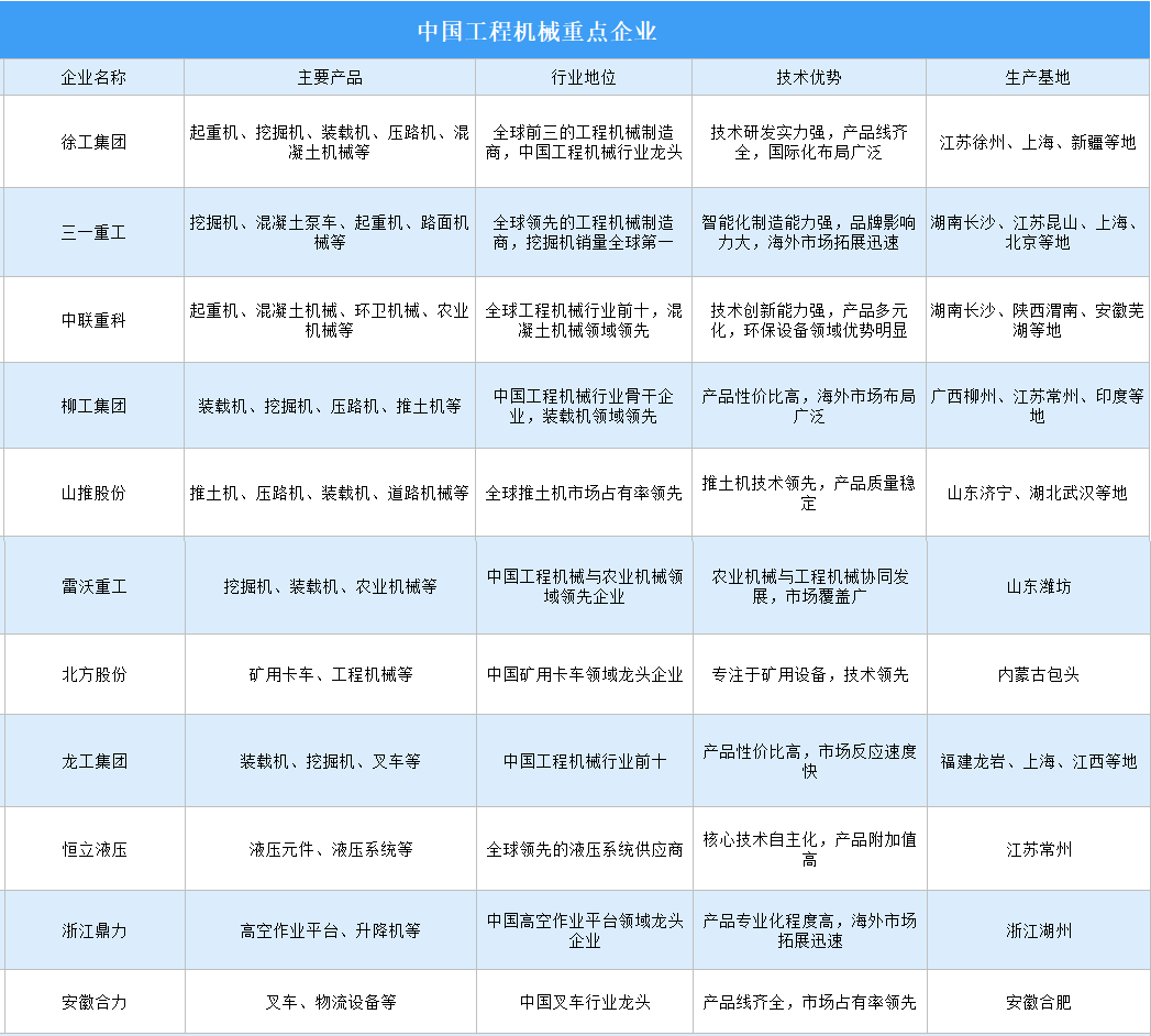 中國(guó)工程機(jī)械行業(yè)近年來快速發(fā)展,涌現(xiàn)出一批具有全球競(jìng)爭(zhēng)力的企業(yè),如徐工集團(tuán)、三一重工、中聯(lián)重科等。這些企業(yè)在技術(shù)研發(fā)、產(chǎn)品創(chuàng)新和市場(chǎng)拓展方面取得了顯著成就,主要競(jìng)爭(zhēng)優(yōu)勢(shì)包括技術(shù)研發(fā)、成本控制、市場(chǎng)覆蓋及國(guó)際化布局。生產(chǎn)基地多集中在江蘇、湖南、山東、福建等制造業(yè)發(fā)達(dá)地區(qū),部分企業(yè)已在海外設(shè)立生產(chǎn)基地以拓展國(guó)際市場(chǎng)。