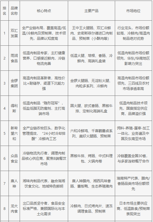 雙匯發(fā)展憑借全產(chǎn)業(yè)鏈布局和技術(shù)優(yōu)勢穩(wěn)居榜首,雨潤食品和金鑼集團分別在低溫與高溫肉制品領(lǐng)域占據(jù)重要地位。得利斯、新希望六和等品牌通過高端化、數(shù)字化策略提升競爭力,而眾品食業(yè)、唐人神、龍大肉食、高金食品和金字火腿則通過細分市場(如B端餐飲、地域特色、出口品質(zhì)、傳統(tǒng)技藝)贏得消費者青睞。
