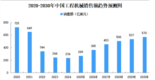 作為中國工程機械行業(yè)最大的單一核心細分市場,挖掘機市場的表現(xiàn)直接影響行業(yè)整體走勢。2020年至2023年,受市場周期波動影響,挖掘機銷售額從2020年的256億美元急劇下降至2023年的83億美元,2024年起,挖掘機市場逐步回暖,2024年銷售額達到84億美元。2025年中國挖掘機銷售額將達91億美元,2030年銷售額將達214億美元。