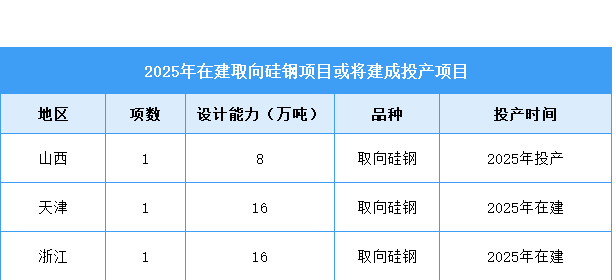 目前市場(chǎng)上,在建及已投產(chǎn)的取向硅鋼項(xiàng)目超過(guò)11項(xiàng),預(yù)計(jì)2025年還將新增產(chǎn)能120萬(wàn)噸。