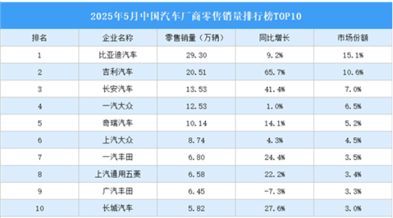 2025年5月中國汽車零售銷量前十廠商零售銷量合計120.40萬輛,市場份額合計62.1%。其中,比亞迪汽車零售銷量29.30萬輛,市場份額15.1%。吉利汽車、長安汽車排名第二和第三,零售銷量分別為20.51萬輛、13.53萬輛,市場份額10.6%、7.0%。一汽大眾、奇瑞汽車、上汽大眾、一汽豐田、上汽通用五菱、廣汽豐田、長城汽車進入前十,依次排名第4-10名。