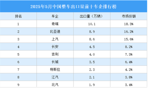 奇瑞整車出口10.1萬輛,市場份額合計(jì)18.3%。比亞迪、上汽排名第二和第三,整車出口量分別為8.9萬輛、8.6萬輛,市場份額分別為16.2%、15.6%。長安、吉利、長城、特斯拉、江汽、北汽、悅達(dá)起亞進(jìn)入前十,依次排名第4-10名。