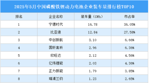寧德時代磷酸鐵鋰動力電池裝車量最高達16.78GWh,市占率36.05%。比亞迪、中創(chuàng)新航排名第二和第三,磷酸鐵鋰動力電池裝車量12.84GWh、3.10GWh,市占率分別為27.58%、6.66%。國軒高科、欣旺達、億緯鋰能、正力新能、瑞浦蘭鈞、極電新能源、蜂巢能源進入前十,依次排名第4-10名。