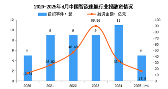 IT桔子數(shù)據(jù)顯示,近年來中國智能座艙投融資事件較少,其中2025年1-4月已披露投資事件共5起,已披露融資金額約15.9億元。