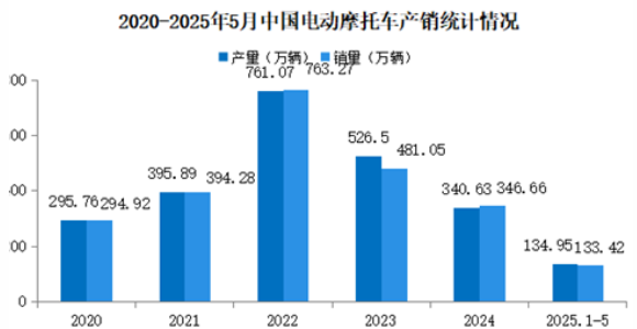 5月,全行業(yè)完成電動摩托車產(chǎn)銷26.15萬輛和26.72萬輛,產(chǎn)量環(huán)比下降5.65%,銷量環(huán)比增長0.45%,同比下降14.88%和19.33%。1-5月,全行業(yè)完成電動摩托車產(chǎn)銷134.95萬輛和133.42萬輛,產(chǎn)量環(huán)比下降5.65%,銷量環(huán)比增長0.45%。