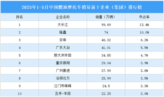 1-5月,全行業(yè)完成燃油摩托車(chē)銷(xiāo)量742.03萬(wàn)輛,同比增長(zhǎng)16.05%。TOP10企業(yè)燃油摩托車(chē)銷(xiāo)量合計(jì)425.64萬(wàn)輛,市占率合計(jì)57.4%。