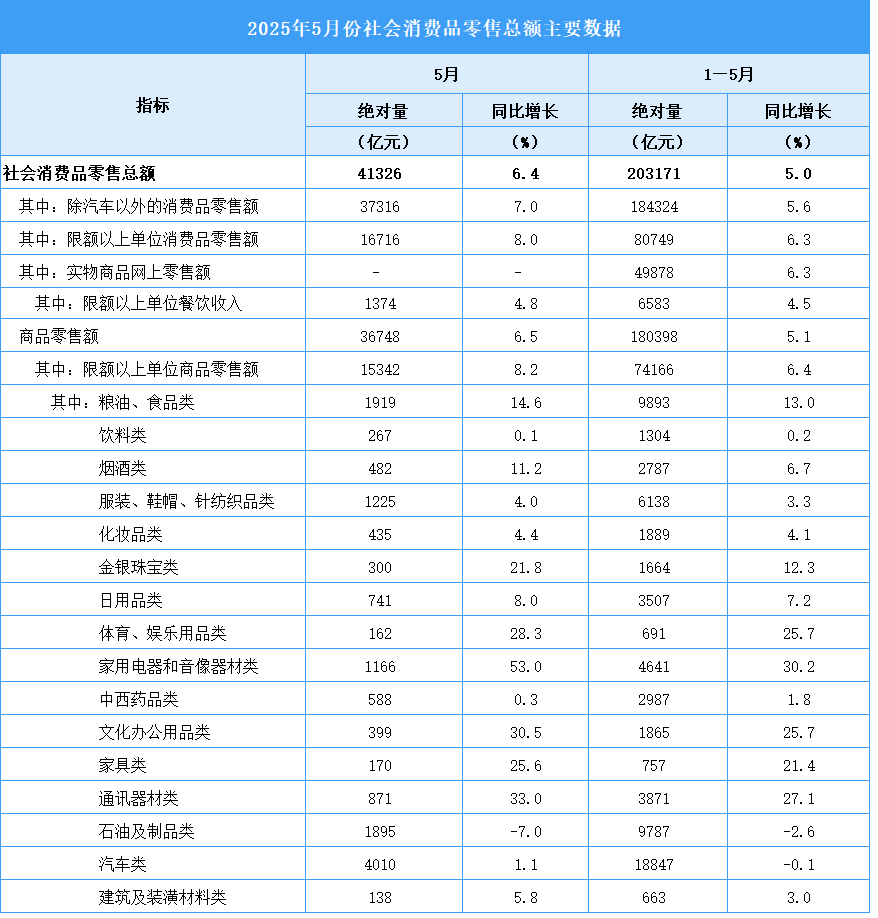 5月份,社會(huì)消費(fèi)品零售總額41326億元,同比增長(zhǎng)6.4%。其中,除汽車以外的消費(fèi)品零售額37316億元,增長(zhǎng)7.0%。1—5月份,社會(huì)消費(fèi)品零售總額203171億元,增長(zhǎng)5.0%。其中,除汽車以外的消費(fèi)品零售額184324億元,增長(zhǎng)5.6%。