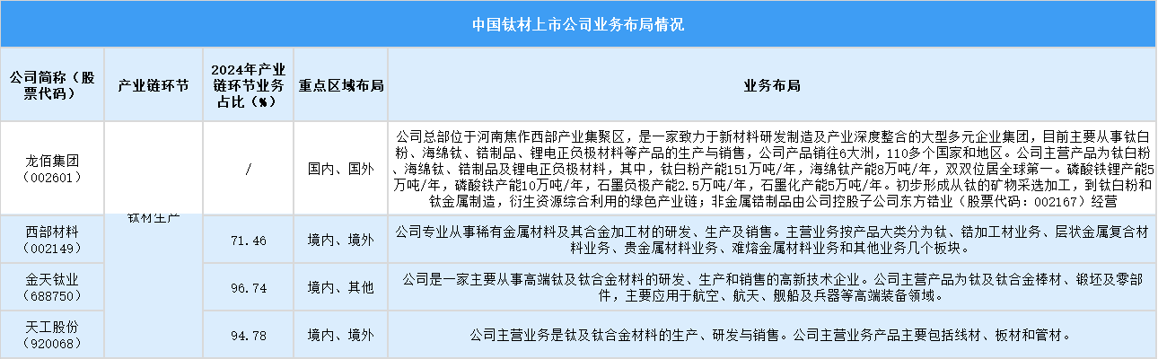 中國(guó)鈦材上市公司業(yè)務(wù)布局呈現(xiàn)顯著差異化,涵蓋鈦礦采選冶煉、鈦材生產(chǎn)等全鏈條,部分企業(yè)聚焦高端領(lǐng)域,如航空航天,部分延伸至多元產(chǎn)品,如鋰電材料和高溫合金,區(qū)域布局覆蓋國(guó)內(nèi)外,業(yè)務(wù)占比與核心產(chǎn)品各具特色。