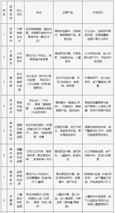 家紡品牌呈現(xiàn)“全層級覆蓋+差異化競爭”格局:頭部品牌(羅萊、水星、富安娜等)通過科技賦能(如智能睡眠產(chǎn)品)、設(shè)計(jì)升級(如藝術(shù)聯(lián)名)、渠道融合(線上線下全滲透)鞏固優(yōu)勢;細(xì)分領(lǐng)域品牌(紫羅蘭的健康功能、多喜愛的兒童家紡、老裁縫的手工定制)則以垂直場景切入,滿足個性化需求。