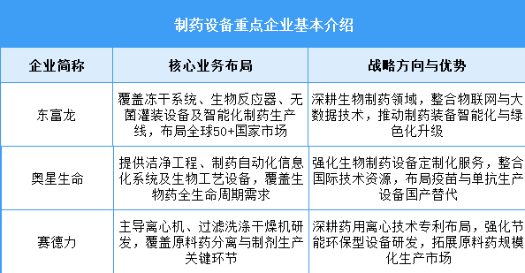 制藥設(shè)備重點企業(yè)普遍通過全產(chǎn)業(yè)鏈技術(shù)整合(如智能化生產(chǎn)線、生物反應器研發(fā))提升高端設(shè)備自給率,依托國際認證與并購加速全球化布局,并聚焦生物制藥、中藥現(xiàn)代化等高增長領(lǐng)域。戰(zhàn)略方向集中在智能化升級、綠色制造技術(shù)突破及生物醫(yī)藥設(shè)備國產(chǎn)替代,以應對醫(yī)藥創(chuàng)新需求與政策驅(qū)動的行業(yè)集中度提升趨勢。