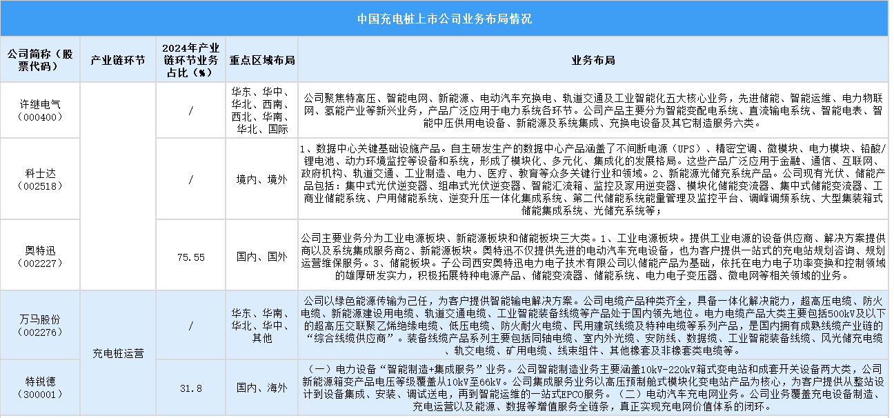 中國充電樁上市公司業(yè)務(wù)布局多元,涉及充電樁制造、運(yùn)營等產(chǎn)業(yè)鏈環(huán)節(jié),2024年部分公司產(chǎn)業(yè)鏈環(huán)節(jié)業(yè)務(wù)占比有差異,重點(diǎn)區(qū)域布局覆蓋國內(nèi)各大區(qū)域及海外,業(yè)務(wù)布局涵蓋電力設(shè)備、新能源光儲(chǔ)充、數(shù)據(jù)中心、工業(yè)電源、儲(chǔ)能等多個(gè)領(lǐng)域。
