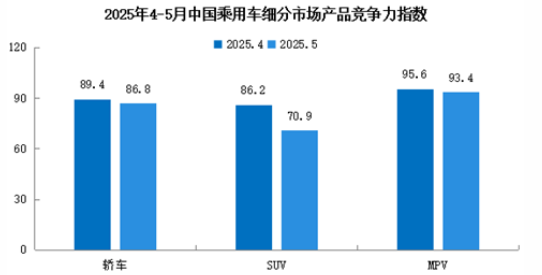 2025年5月轎車市場產(chǎn)品競爭力指數(shù)為86.8,環(huán)比下滑2.6個點,其中產(chǎn)品評價、價格力度和用戶口碑指標環(huán)比均下滑,下滑幅度分別為2.5、2.5和0.7個點,而市場熱度指標環(huán)比上升0.4個點。SUV市場產(chǎn)品競爭力指數(shù)為70.9,環(huán)比下滑15.3個點,其中價格力度、產(chǎn)品評價和市場熱度指標環(huán)比均下滑,下滑幅度分別為15.6、15.1和0.3個點,而用戶口碑指標環(huán)比上升0.1個點。MPV市場產(chǎn)品競爭力指數(shù)為93.4,環(huán)比下滑2.2個點,其中價格力度、產(chǎn)品評價、用戶口碑和市場熱度指標環(huán)比均下滑,下滑幅度分別為4.3、2.6、0.7和0.2個點。