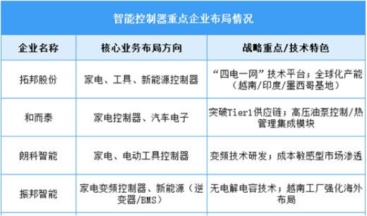 當(dāng)前智能控制器行業(yè)的核心企業(yè)普遍采取多元化應(yīng)用領(lǐng)域布局,以家電和工具控制器為基本盤,同時向新能源、汽車電子等高增長領(lǐng)域延伸。技術(shù)發(fā)展聚焦于變頻控制、模塊集成與全球化產(chǎn)能建設(shè),通過海外基地降低供應(yīng)鏈風(fēng)險(xiǎn)并貼近終端市場。行業(yè)整體呈現(xiàn)從單一部件向系統(tǒng)解決方案升級的趨勢,競爭焦點(diǎn)逐步從規(guī)模化生產(chǎn)轉(zhuǎn)向技術(shù)附加值提升與細(xì)分場景滲透能力。
