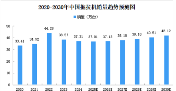 拖拉機(jī)是重要的農(nóng)用機(jī)械之一,通常由動(dòng)力、傳動(dòng)、液壓、電子系統(tǒng)、底盤、工作裝置等模塊組成,用於牽引和驅(qū)動(dòng)各種農(nóng)機(jī)具,其核心功能是為農(nóng)業(yè)生產(chǎn)提供動(dòng)力支持,應(yīng)用工況涵蓋旱田、水田、果園、休閑農(nóng)業(yè)等多種作業(yè)場(chǎng)景。近年來(lái),中國(guó)拖拉機(jī)銷量總體較為穩(wěn)定。2024年中國(guó)拖拉機(jī)銷量37.31萬(wàn)臺(tái),2020-2024年復(fù)合年均增長(zhǎng)率2.8%。2025年中國(guó)拖拉機(jī)銷量37.01萬(wàn)臺(tái),2030年銷量將達(dá)42.12萬(wàn)臺(tái)。