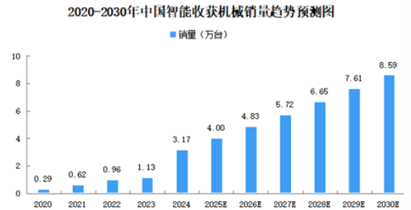 智能收獲機(jī)械通常指搭載先進(jìn)的智能感知、電液控制、精準(zhǔn)作業(yè)、遠(yuǎn)程通訊系統(tǒng),可實(shí)現(xiàn)智能駕駛的收獲機(jī)械。目前中國智能收獲機(jī)械還在發(fā)展初級(jí)階段,智能收獲機(jī)械市場(chǎng)較小。2024年中國智能收獲機(jī)械銷量3.17萬臺(tái),2020-2024年復(fù)合年均增長(zhǎng)率81.1%。中國收獲機(jī)械技術(shù)向精準(zhǔn)智能化、高效大型化轉(zhuǎn)型,國家農(nóng)業(yè)現(xiàn)代化戰(zhàn)略推動(dòng)高端收獲機(jī)械研發(fā),補(bǔ)貼向智能大機(jī)型傾斜。2025年中國智能收獲機(jī)械銷量4.00萬臺(tái),2030年將達(dá)8.59萬臺(tái)。