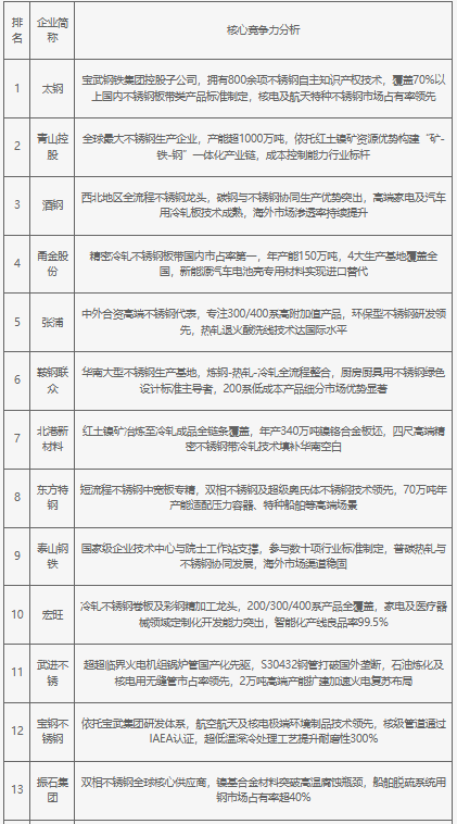 2025年中國不銹鋼行業(yè)重點企業(yè)核心競爭力
