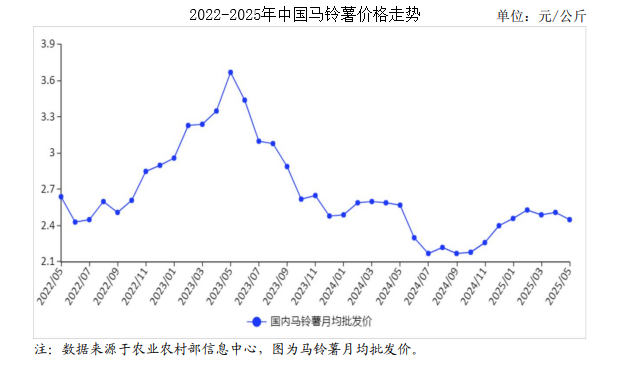 2025年5月,馬鈴薯價(jià)格季節(jié)性下跌。在采挖區(qū)域擴(kuò)大、生產(chǎn)成本降低和加工消費(fèi)需求減少等因素共同作用下,馬鈴薯市場價(jià)格延續(xù)下跌趨勢的可能性較大。
