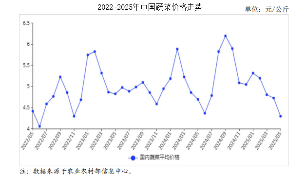 2025年5月,蔬菜價(jià)格季節(jié)性下行。北方露地蔬菜供應(yīng)增加,冷涼蔬菜逐步上市,短期菜價(jià)仍有下行空間。但隨著夏季入汛,暴雨、高溫等可能影響局地產(chǎn)銷(xiāo)銜接,部分品種價(jià)格或止跌反彈,后期逐步轉(zhuǎn)入季節(jié)性上行。