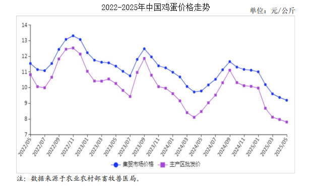 2025年5月,雞蛋價(jià)格小幅下跌。全國(guó)在產(chǎn)蛋雞存欄量以穩(wěn)為主,雞蛋市場(chǎng)供應(yīng)充足,消費(fèi)整體仍處于淡季,預(yù)計(jì)近期蛋價(jià)低位震蕩運(yùn)行。