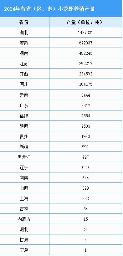 近年來,各地將小龍蝦產(chǎn)業(yè)作為重要的富民產(chǎn)業(yè)和縣域特色產(chǎn)業(yè),通過科學(xué)布局、規(guī)劃引領(lǐng)、金融支持、科技支撐、品牌建設(shè)等“政策組合拳”推動(dòng)小龍蝦產(chǎn)業(yè)升級(jí),有力促進(jìn)小龍蝦產(chǎn)業(yè)持續(xù)健康發(fā)展。2024年,我國(guó)有27個(gè)省份開展小龍蝦養(yǎng)殖,分布廣泛,但集中度較高,主要集中在湖北、安徽、湖南、江蘇、江西等長(zhǎng)江中下游平原及沿江湖區(qū)。四川、山東、河南、浙江等地也有一定養(yǎng)殖規(guī)模。