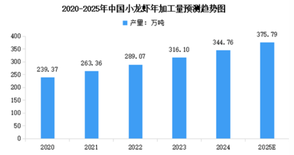 2024年,全國小龍蝦年加工量138.37萬噸,同比下降1.33%。2016—2021年,小龍蝦年加工量占小龍蝦養(yǎng)殖產(chǎn)量的比重穩(wěn)定在25%左右,2022年占比大幅提高到42.10%,2023年占比44.36%,2024年占比40.13%。2025年中國小龍蝦年加工量將保持在145.29萬噸左右。