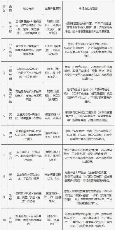 2025年中國最受消費(fèi)者喜愛的十大擦窗機(jī)器人品牌分別為科沃斯、石頭科技、云鯨智能、追覓科技、美的、海爾、格力、米家、樂橙、玻妞。