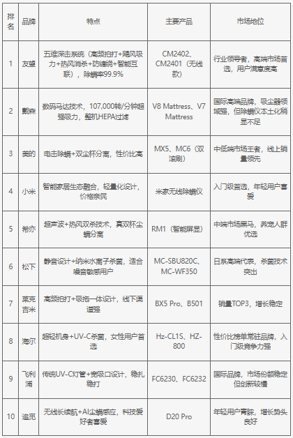 除螨儀市場競爭激烈,友望憑借技術創(chuàng)新和用戶體驗穩(wěn)居行業(yè)領先地位,美的、萊克吉米在中低端市場占據重要位置,而戴森、松下等國際品牌在高端市場仍具影響力。