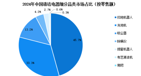 從細(xì)分產(chǎn)品來看,掃地機(jī)器人在中國清潔電器市場中占比最大,達(dá)到45.7%。掃地機(jī)器人能夠自動(dòng)清掃地面灰塵、雜物,部分產(chǎn)品還具備拖地功能,通過智能導(dǎo)航系統(tǒng),如激光導(dǎo)航、視覺導(dǎo)航等,可自主規(guī)劃清掃路徑,實(shí)現(xiàn)全屋高效清潔。其次是洗地機(jī),市場占比33.3%,洗地機(jī)集吸塵、拖地于一體,能有效去除地面頑固污漬和灰塵,適合家庭中硬質(zhì)地面的深度清潔。吸塵器占比13.2%,排名第三。其他品類(如除螨儀、擦窗機(jī)器人、布藝清潔機(jī)等)合計(jì)占比7.7%,滿足特定場景需求。