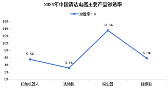 2024年,掃地機(jī)器人、洗地機(jī)、吸塵器、除螨儀滲透率分別達(dá)到5.5%、3.1%、13.5%、5.8%。未來隨著AIoT生態(tài)整合(如清潔電器與智能音箱聯(lián)動(dòng))和健康場(chǎng)景深化(如帶除菌功能產(chǎn)品普及),清潔電器將從“工具”進(jìn)化為“家庭清潔管家”,中國(guó)清潔電器各品類的滲透率將進(jìn)一步提高。
