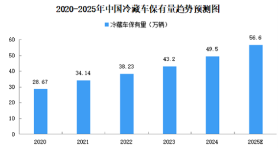 中國冷鏈需求持續(xù)增長,推動(dòng)冷藏車保有量不斷增加。截至2024年,中國冷藏車保有量為49.5萬輛,同比增長14.58%。截至2025年一季度,中國冷藏車保有量為50.6萬輛,同比增長14.43%。2025年中國冷藏車保有量將達(dá)56.6萬輛。
