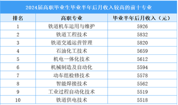教育數(shù)據(jù)咨詢和評(píng)估機(jī)構(gòu)麥可思發(fā)布2025年版就業(yè)藍(lán)皮書,藍(lán)皮書顯示,2024屆高職畢業(yè)生畢業(yè)半年后月收入較高的前十專業(yè),鐵道機(jī)車運(yùn)用與維護(hù)、鐵道工程技術(shù)、鐵道交通運(yùn)營(yíng)管理、石油化工技術(shù)、機(jī)電一體化技術(shù)、機(jī)械制造及自動(dòng)化、動(dòng)車組檢修技術(shù)、智能焊接技術(shù)、工業(yè)過(guò)程自動(dòng)化技術(shù)、鐵道供電技術(shù)上榜。TOP10專業(yè)月收入均超5000元,其中,鐵道機(jī)車運(yùn)用與維護(hù)月收入最高達(dá)5926元。