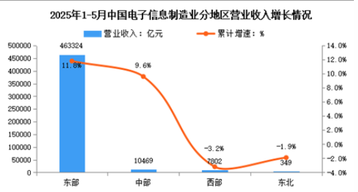 1—5月,規(guī)模以上電子信息制造業(yè)東部地區(qū)實(shí)現(xiàn)營業(yè)收入46324億元,同比增長11.8%;較1—4月回落0.8個(gè)百分點(diǎn);中部地區(qū)實(shí)現(xiàn)營業(yè)收入10469億元,同比增長9.6%,較1—4月回落0.7個(gè)百分點(diǎn);西部地區(qū)實(shí)現(xiàn)營業(yè)收入7802億元,同比下降3.2%,較1—4月提高0.1個(gè)百分點(diǎn);東北地區(qū)實(shí)現(xiàn)營業(yè)收入349億元,同比下降1.9%,較1—4月回落5.4個(gè)百分點(diǎn)。5月份,東部地區(qū)實(shí)現(xiàn)營業(yè)收入9778億元,同比增長8.9%;中部地區(qū)實(shí)現(xiàn)營業(yè)收入2199億元,同比增長7.1%;西部地區(qū)實(shí)現(xiàn)營業(yè)收入1673億元,同比下降3%;東北地區(qū)實(shí)現(xiàn)營業(yè)收入70億元,同比下降18.8%。