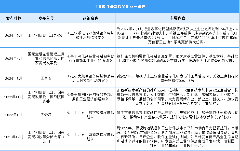 近年來,在中國工業(yè)軟件行業(yè)受到各級政府的高度重視和國家產(chǎn)業(yè)政策的重點支持。國家陸續(xù)出臺了多項政策,鼓勵工業(yè)軟件行業(yè)發(fā)展與創(chuàng)新,《關(guān)于實施促進(jìn)民營經(jīng)濟(jì)發(fā)展近期若干舉措》《科技成果賦智中小企業(yè)專項行動(2023-2025年)》《“機(jī)器人”+應(yīng)用行動實施方案》等產(chǎn)業(yè)政策為工業(yè)軟件行業(yè)的發(fā)展提供了明確、廣闊的市場前景,為企業(yè)提供了良好的生產(chǎn)經(jīng)營環(huán)境。