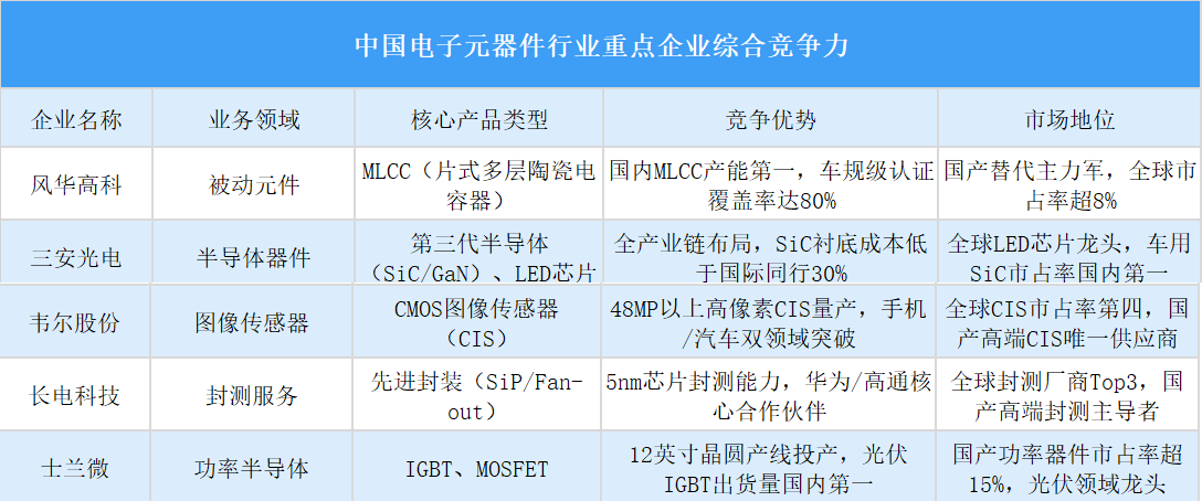 中國電子元器件企業(yè)競爭呈現(xiàn)出企業(yè)數(shù)量多、競爭激烈的特點(diǎn),中國電子元器件企業(yè)在中低端領(lǐng)域有一定優(yōu)勢(shì)但高端市場(chǎng)仍需突破。目前行業(yè)整合加速、頭部企業(yè)不斷提升競爭力,同時(shí)面臨著國產(chǎn)替代機(jī)遇與國際巨頭競爭壓力并存的局面。
