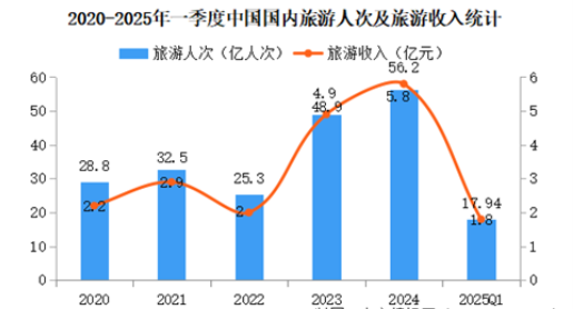 2024年,國內(nèi)居民出游56.2億人次,同比增長14.8%。國內(nèi)居民出游總花費(fèi)5.8萬億元,同比增長17.1%。2025年一季度,國內(nèi)出游人次17.94億,比上年同期增加3.75億,同比增長26.4%。2025年一季度,國內(nèi)居民出游總花費(fèi)1.80萬億元,比上年同期增加0.28萬億元,同比增長18.6%。
