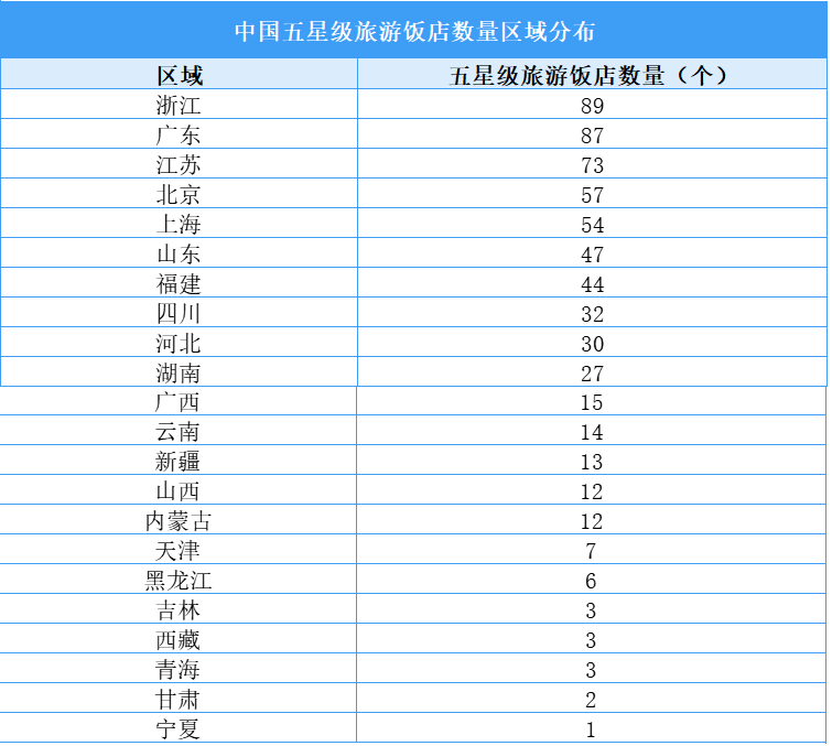 其中,五星級旅游飯店825個,浙江89個,廣東87個,江蘇73個,北京、上海超50個,分別為57個、54個。山東、福建超40個,分別為47個、44個。