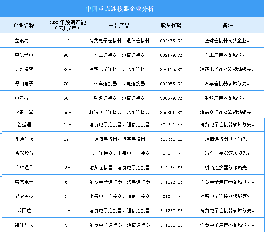 連接器作為電子設(shè)備中實(shí)現(xiàn)電氣連接的核心元件,其技術(shù)參數(shù)與應(yīng)用場(chǎng)景直接影響系統(tǒng)性能。近年來,通信、消費(fèi)電子、新能源汽車、工控安防等下游行業(yè)的持續(xù)發(fā)展為連接器行業(yè)帶來了廣闊的市場(chǎng)空間和發(fā)展機(jī)遇。