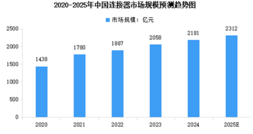 中國(guó)連接器市場(chǎng)持續(xù)增長(zhǎng),占據(jù)全球連接器市場(chǎng)規(guī)模首位。2023年中國(guó)連接器市場(chǎng)規(guī)模達(dá)到2058億元,較上年增長(zhǎng)9.1%,2024年市場(chǎng)規(guī)模達(dá)到約2181億元。2025年中國(guó)連接器市場(chǎng)規(guī)模將達(dá)到2312億元。
