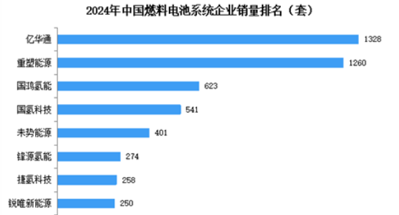 2024年,中國約有60家企業(yè)系統(tǒng)出貨。億華通燃料電池系統(tǒng)銷量為1328套,占領(lǐng)先地位,市占率為18.7%;重塑能源銷量1260套,位列第二,市占率17.8%;國鴻氫能銷量623套,位列第三,市占率8.8%;第四是國氫科技銷量541套,市占率為7.6%。Top5系統(tǒng)企業(yè)占比58.5%。