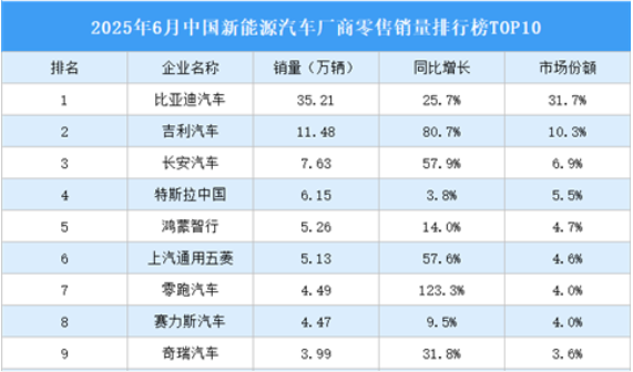 2025年上半年中國(guó)零售銷(xiāo)量前十新能源汽車(chē)廠商零售銷(xiāo)量合計(jì)426.11萬(wàn)輛,市場(chǎng)份額合計(jì)77.8%。比亞迪汽車(chē)零售銷(xiāo)量最高達(dá)161.00萬(wàn)輛,市場(chǎng)份額29.4%。吉利汽車(chē)、長(zhǎng)安汽車(chē)排名第二和第三,零售銷(xiāo)量分別為68.58萬(wàn)輛、36.75萬(wàn)輛,市場(chǎng)份額分別為12.5%、6.7%。上汽通用五菱、特斯拉中國(guó)、奇瑞汽車(chē)、鴻蒙智行、理想汽車(chē)、零跑汽車(chē)、小鵬汽車(chē)進(jìn)入前十,依次排名第4-10名。