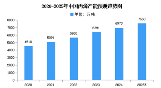 2024年中國丙烯產能為6973萬噸,當年新增713萬噸,同比下降1.38%,年度產能增速降至9.11%,產能擴張步伐逐漸放緩。2025年中國丙烯產能將超過7500萬噸。