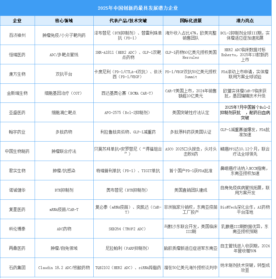 中國創(chuàng)新藥行業(yè)最具發(fā)展?jié)摿ζ髽I(yè)集中在技術(shù)突破與國際化能力雙優(yōu)的頭部企業(yè):百濟神州憑借全球化布局和實體瘤管線拓展穩(wěn)居龍頭;恒瑞醫(yī)藥以ADC平臺和多靶點管線引領(lǐng)本土創(chuàng)新;康方生物依托雙抗技術(shù)和FDA滾動申請打開全球市場;榮昌生物通過ADC海外授權(quán)和胃癌適應(yīng)癥獲批確立技術(shù)標(biāo)桿地位;信達(dá)生物深耕代謝疾病和東南亞直銷網(wǎng)絡(luò);金斯瑞生物以CAR-T療法和基因編輯技術(shù)領(lǐng)跑CGT賽道;亞盛醫(yī)藥憑借中國首個Bcl-2抑制劑躋身血液瘤一線陣營。這些企業(yè)依托ADC、雙抗、細(xì)胞治療三大技術(shù)高地,疊加政策紅利和出海加速,正重塑全球醫(yī)藥創(chuàng)新格局。